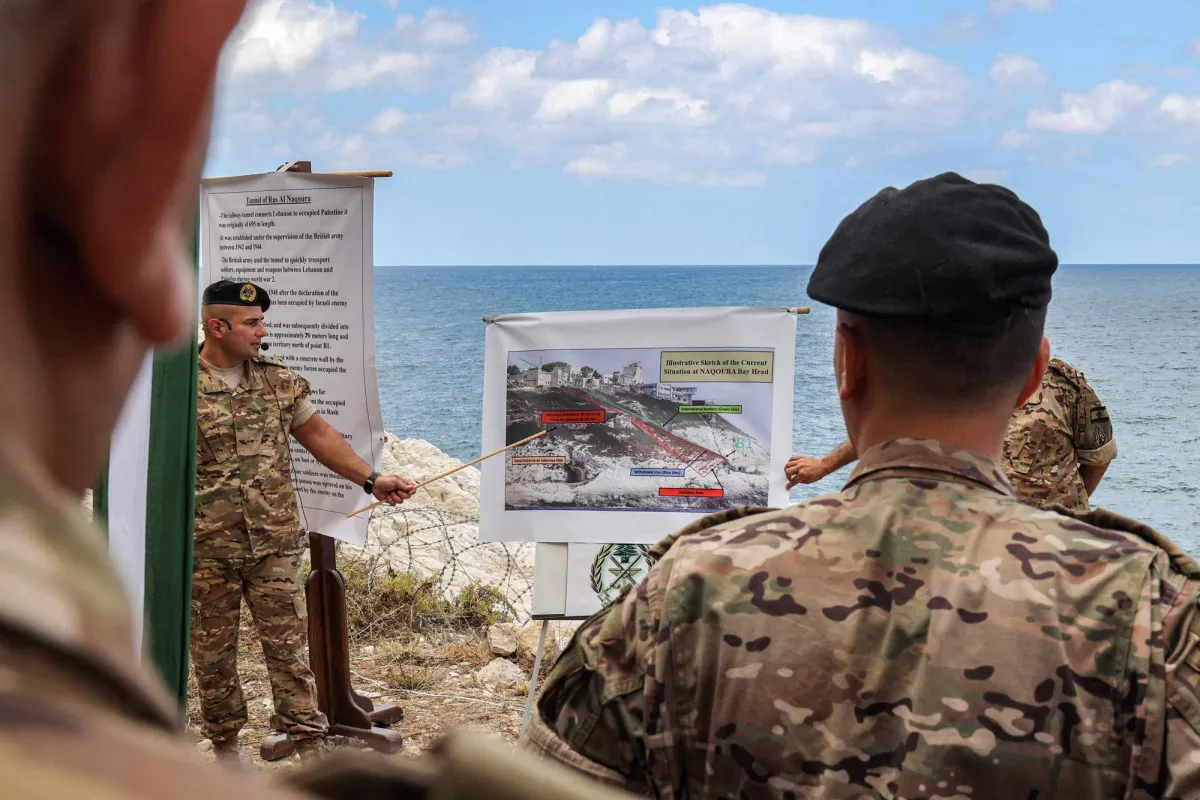 ضابط لبناني يعرض لممثلي الدول الدائمة العضوية في مجلس الأمن الدولي الوضع على الحدود بين لبنان وإسرائيل (أ.ف.ب)