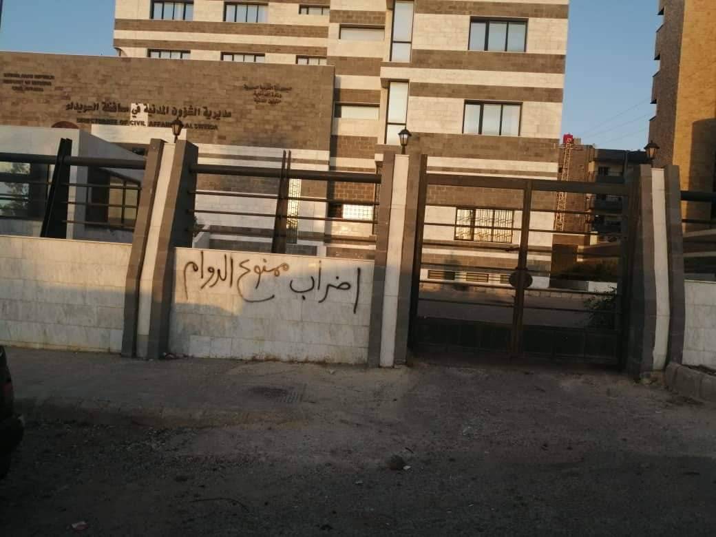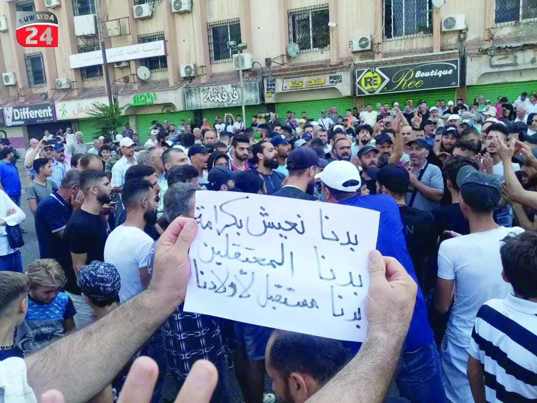 كانت مدينة السويداء قد شهدت، أمس، إغلاقاً تاماً لجميع الطرق الرئيسية والفرعية المؤدية للمدينة من قِبل عشرات المواطنين المحتجّين، حيث تجمَّع العشرات من أبناء القرى والبلدات للاحتجاج على تردي الواقع الاقتصادي، ولتطبيق العصيان المدني الذي أعلنته عشائر السويداء، كما تشهد جميع الدوائر الحكومية والمحالّ التجارية إغلاقاً تاماً، وسط انعدام في حركة المرور.