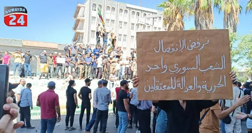 وجاء ذلك بعد ساعات من قيام دمشق بمحاولة لاحتواء الاحتجاجات بتكليف محافظ السويداء بسام بارسيك لقاء الرئيس الروحي للطائفة الدرزية شيخ العقل حكمت الهجري في دارة بلدة قنوات بريف السويداء، مساء الأربعاء.