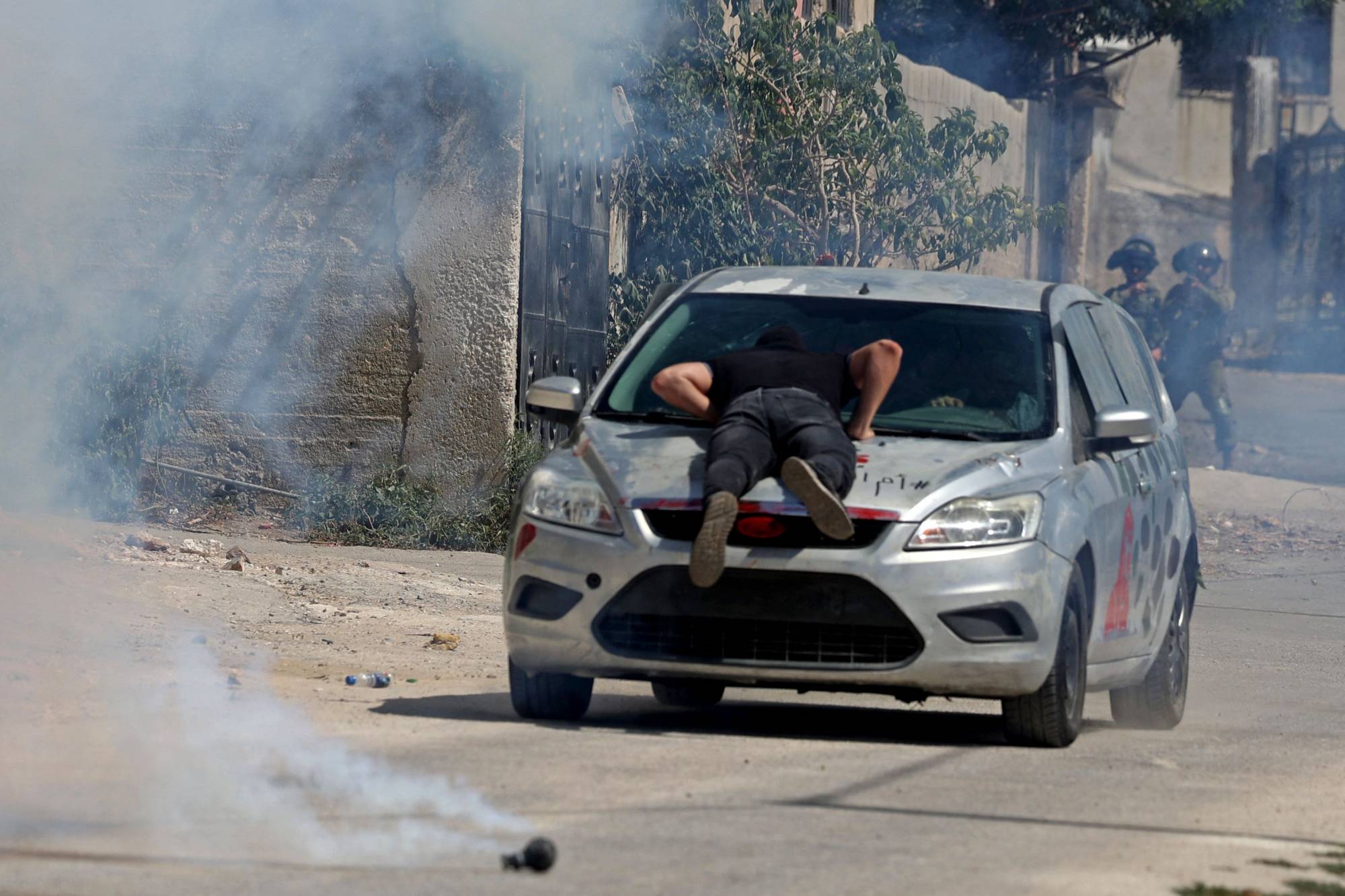 فلسطيني يحاول الاحتماء من قنابل مسيلة للدموع أطلقتها قوات الأمن الإسرائيلية لتفريق احتجاجات في كفر قدوم بالضفة الغربية اليوم الجمعة (أ.ف.ب)