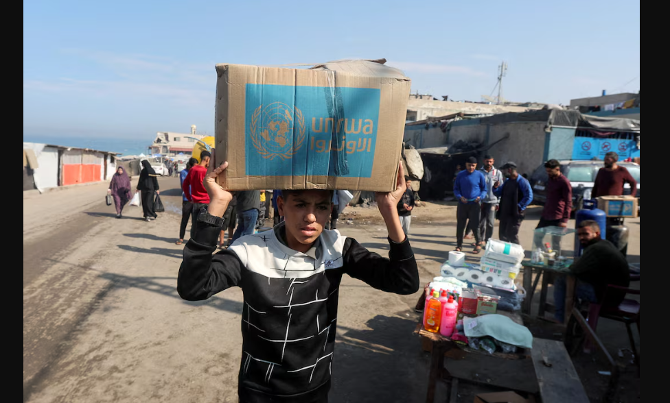 فتى فلسطيني في قطاع غزة يحمل كرتونة مساعدات تحمل شعار «الأونروا» (رويترز)