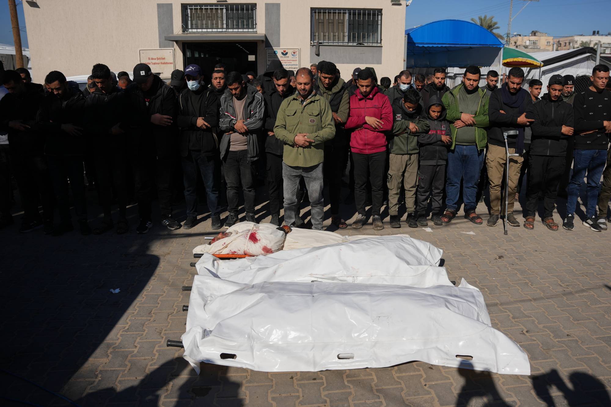 فلسطينيون يشيّعون قتلى من عائلة واحدة سقطوا بغارة إسرائيلية في دير البلح بوسط قطاع غزة الجمعة (أ.ب)