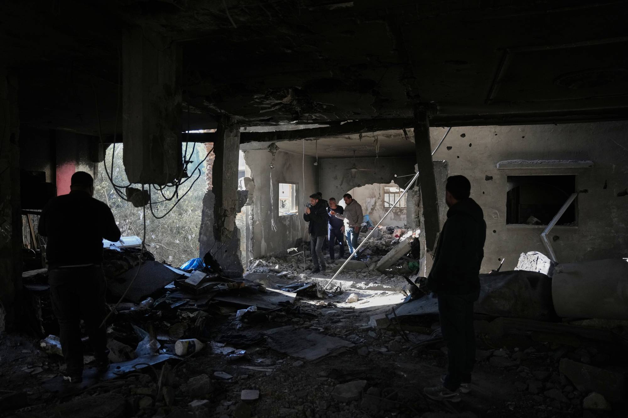 فلسطينيون يعاينون منزل عائلة الحولي بعد استهدافه بغراة إسرائيلية في دير البلح بوسط قطاع غزة الجمعة (أ.ب)