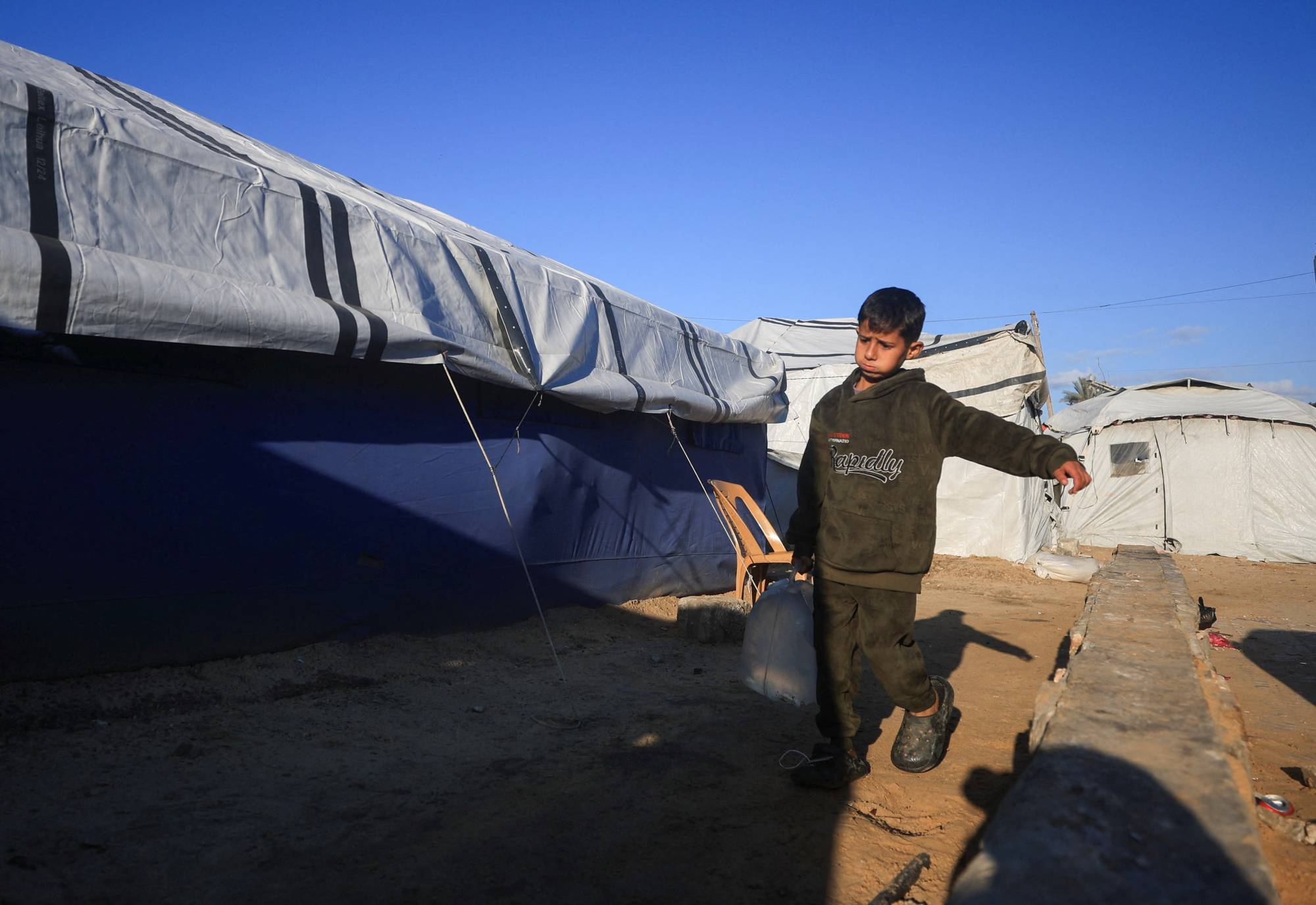 فتى يحمل دلواً مملوءاً بالماء في مخيم للنازحين بمدينة غزة الخميس (رويترز)
