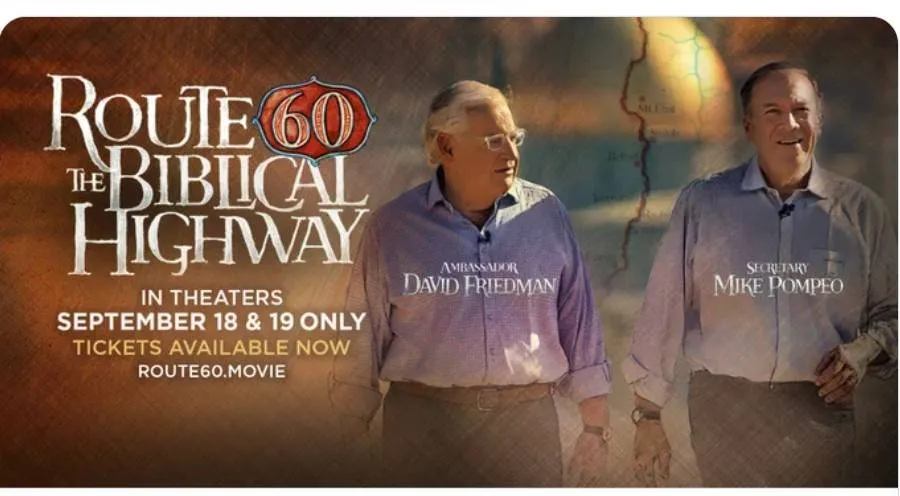 وأطلق بومبيو وفريدمان على الفيلم اسم «طريق 60: الطريق السريع التوراتي»، وهو الطريق الطويل الذي يبدأ من مدينة الناصرة العربية في الجليل، التي تعد مدينة البشارة بالسيد المسيح، والتي عاش فيها أطول فترات حياته، وسمي على اسمها «الناصري»، وينتهي في مدينة بئر السبع الصحراوية في النقب، التي استقر للعيش فيها النبي إبراهيم الخليل. وهو الطريق الذي يخترق جبال الضفة الغربية وهضابها، ثم يتجاوز القدس جنوباً إلى بيت لحم، ومن ثم إلى النقب. ويبلغ طوله 223 كيلومتراً (146 ميلاً).