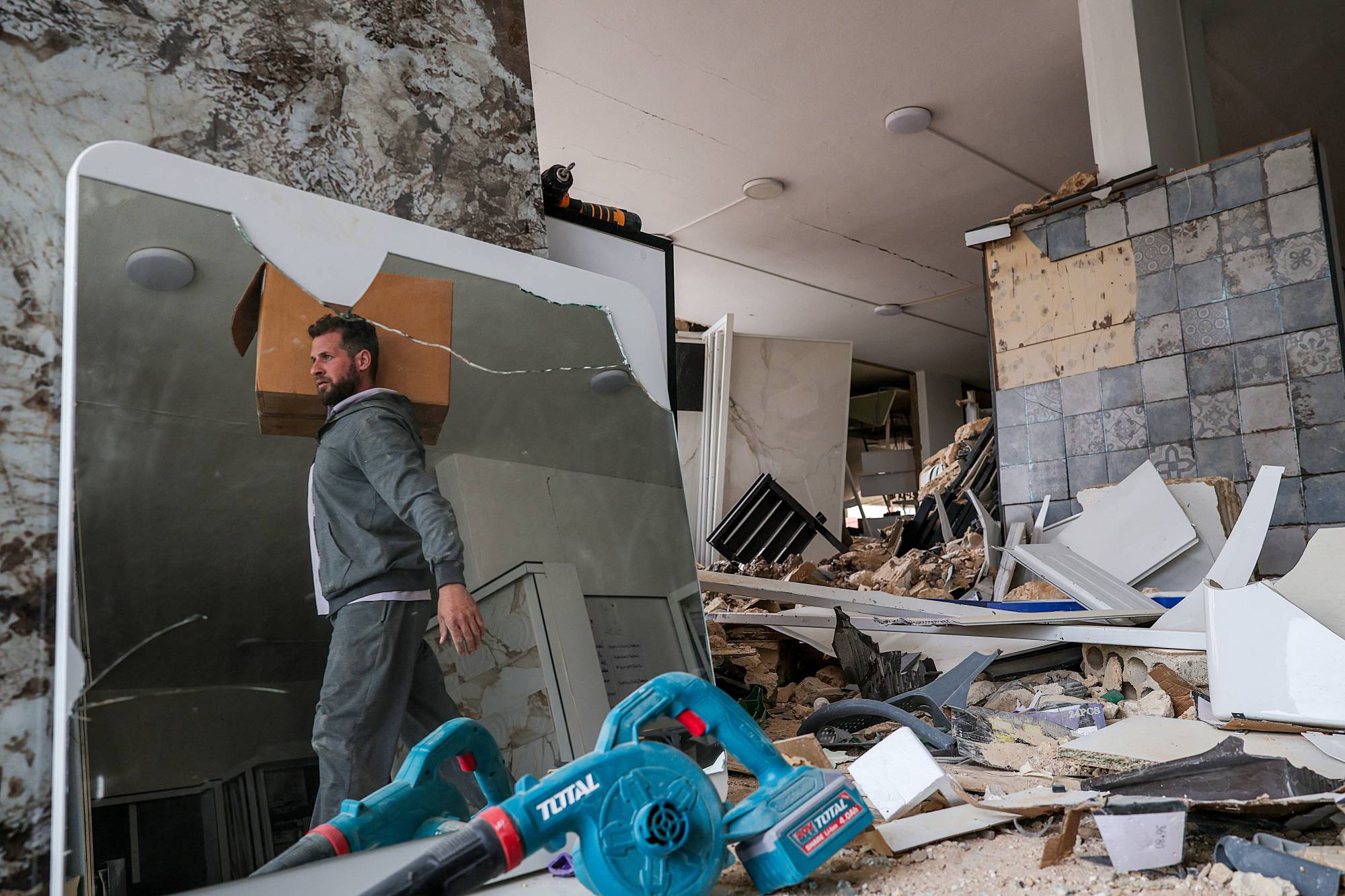 مواطنون لبنانيون يزيلون الأنقاض من محل تجاري دُمِّر نتيجة القصف الإسرائيلي في مدينة النبطية بجنوب لبنان (أ.ب)