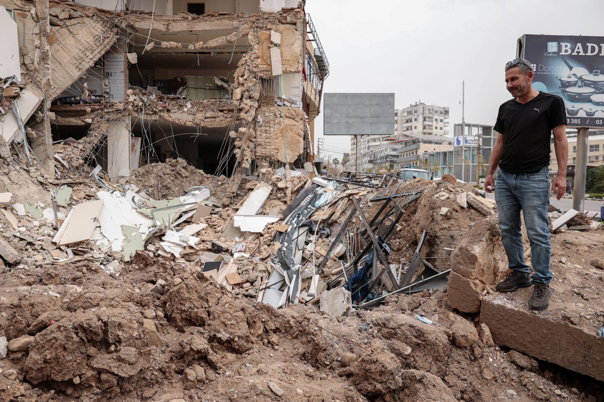 يقف موسى بدران بجوار المبنى الذي يضم أعماله التجارية بعدما دُمّر في غارة إسرائيلية قبيل بدء سريان وقف إطلاق النار لمدة 10 أيام بين لبنان وإسرائيل في بلدة العباسية بقضاء صور (رويترز)