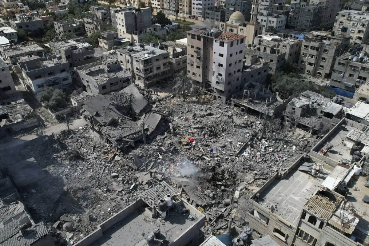 مبانٍ مدمرة بالقصف الإسرائيلي على مخيم البريج للاجئين في قطاع غزة (أ.ب)