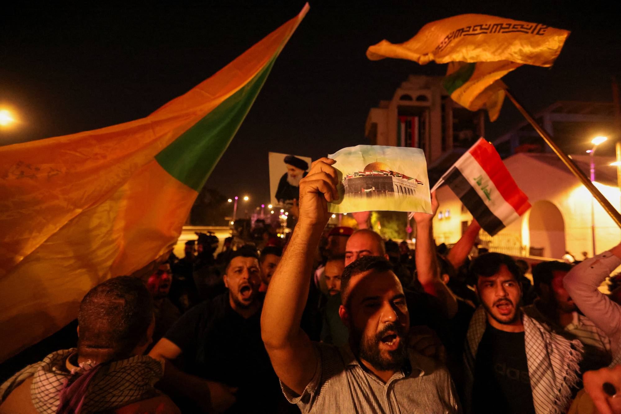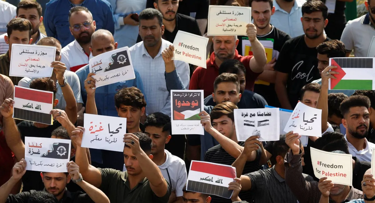 وخرج المئات من العراقيين مساء الثلاثاء في مظاهرات شعبية للتنديد بقصف إسرائيل لمستشفى المعمداني في غزة وتسبب بمقتل وإصابة أكثر من 500 مدني. وهتف المتظاهرون الذين تجمعوا في ساحة التحرير وسط بغداد ضد أميركا، بصفتها داعم إسرائيل، كما نددوا باستمرار استهداف المستشفيات ومنازل الأهالي في غزة منذ عشرة أيام.