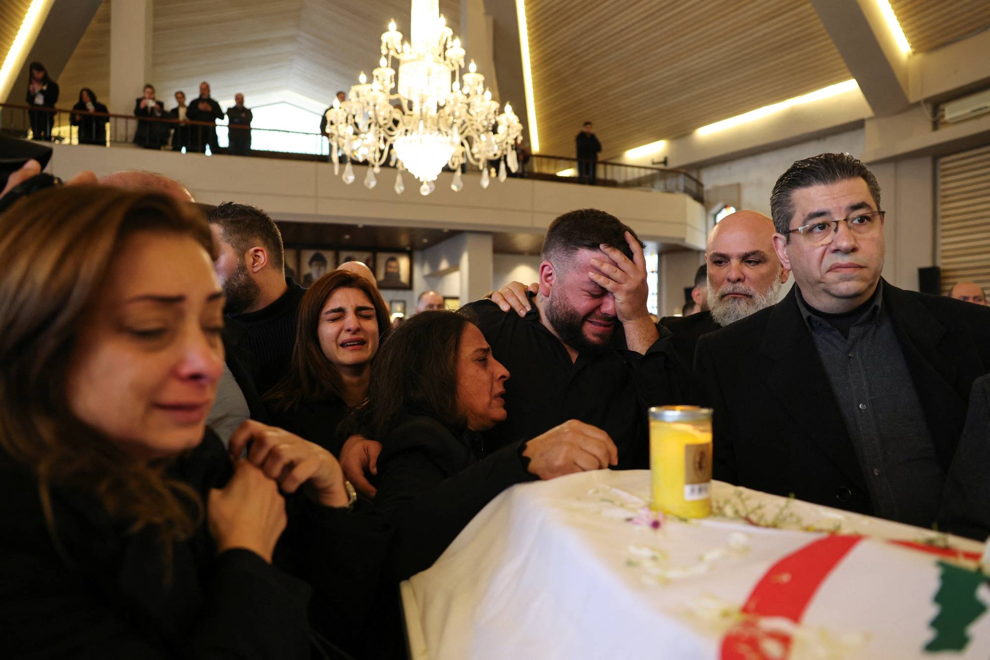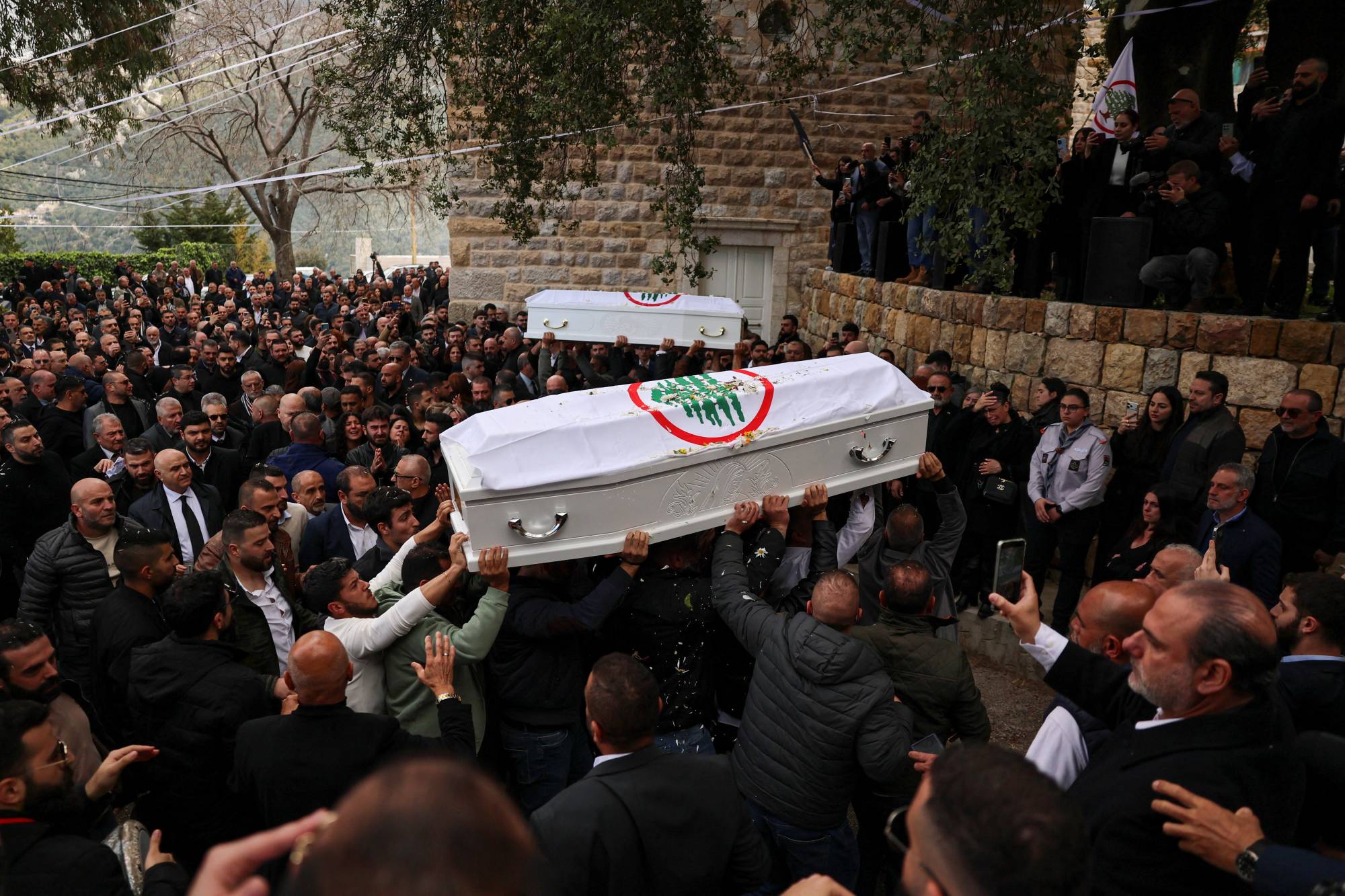 تشييع القيادي في «القوات اللبنانية» بيار معوض وزوجته فلافيا اللذين قتلا بغارة إسرائيلية استهدفت منطقة عين سعادة شرق بيروت (رويترز)