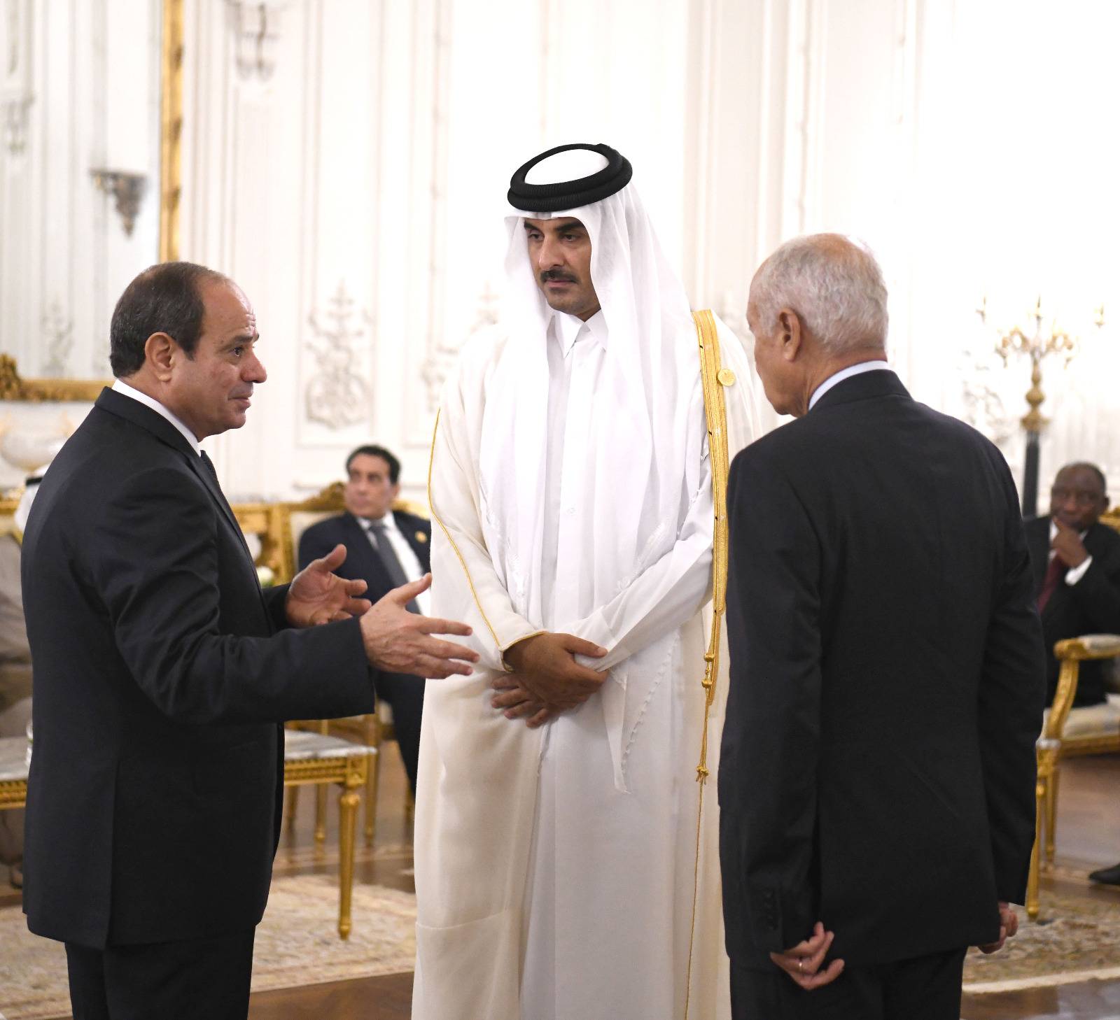 جدل آخر أثارته القمة، بعد مغادرة أمير قطر الشيخ تميم بن حمد آل ثاني قاعة القمة بالعاصمة الإدارية الجديدة، خلال إلقاء المشاركين كلماتهم، ودون أن يلقي كلمة. وهنا يقول المتحدث الرئاسي: «لا توجد مسألة تتعلق بقطر؛ بل على العكس كان هناك مشاركة على أعلى مستوى، ولم تُلقِ جميع الدول كلمات، فهذه كانت قمة تشاورية دعت لها مصر، وشارك فيها ضيوف مقدّرون. وأمير قطر غادر لارتباطات أخرى لديه، وهذا أمر طبيعي».