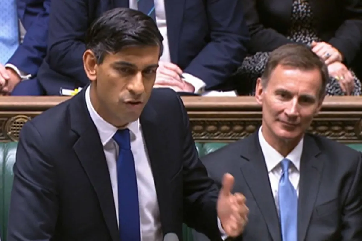 صورة مأخوذة من فيديو يظهر فيه وزير الخزانة البريطاني جيريمي هانت (يمين) وهو يجلس إلى جانب رئيس الوزراء البريطاني ريشي سوناك في مجلس العموم بلندن يوم 25 أكتوبر 2023 (أ.ف.ب)