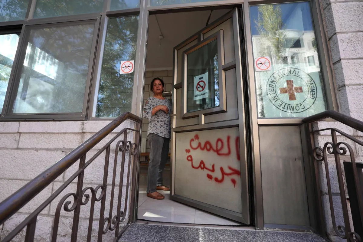 موظفة تدخل مكاتب الصليب الأحمر بعد أن خط نشطاء فلسطينيون عبارة «الصمت جريمة» في رام الله بالضفة الغربية (أ.ف.ب)