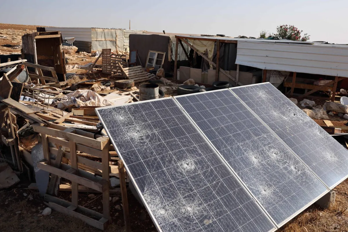 جانب من الأضرار جراء هجوم المستوطنين الإسرائيليين على خربة وادي السيق (أ.ف.ب)