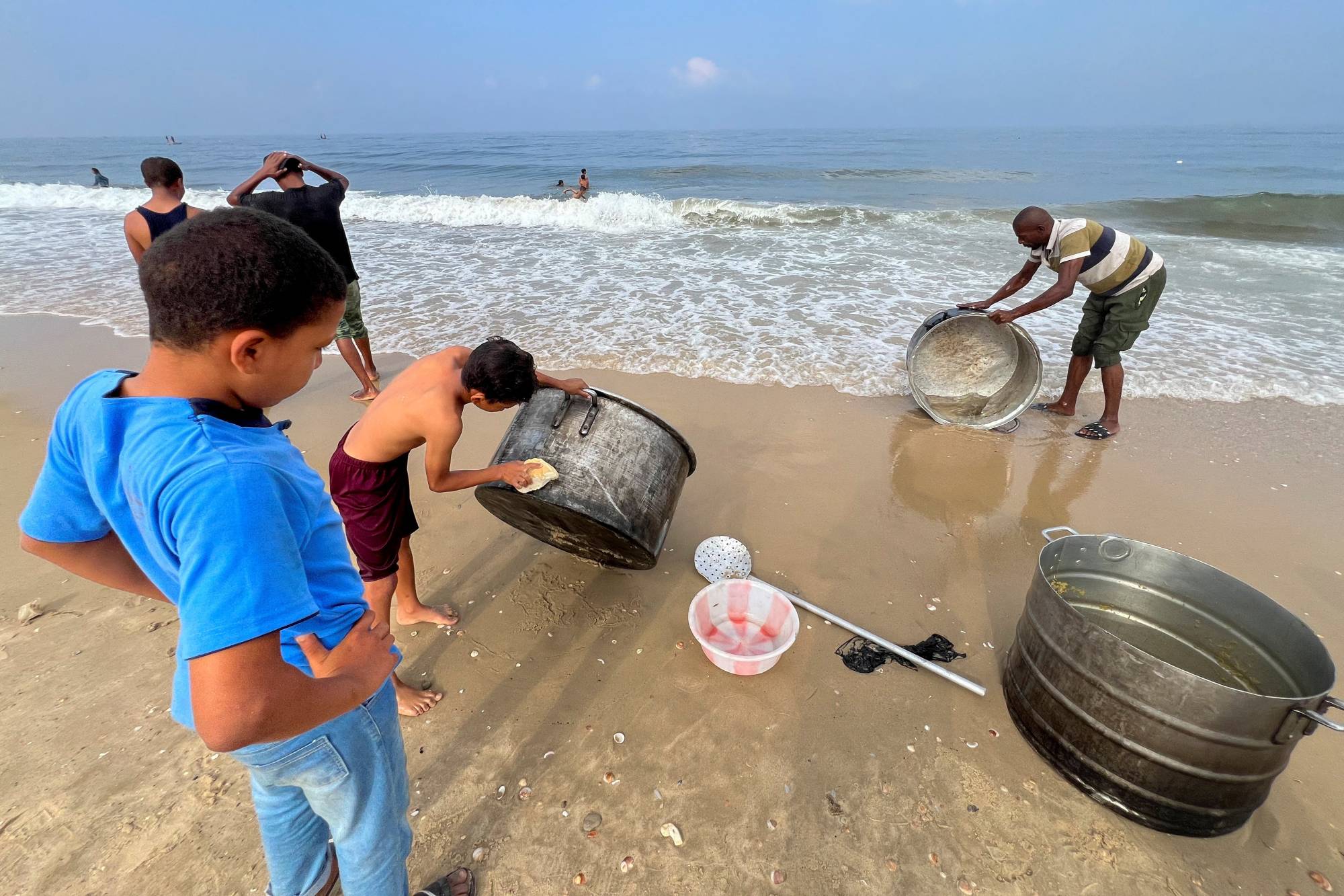 فلسطينيون يغسلون أواني الطبخ في مياه البحر المتوسط بسبب انقطاع المياه في قطاع غزة يوم الخميس (رويترز)