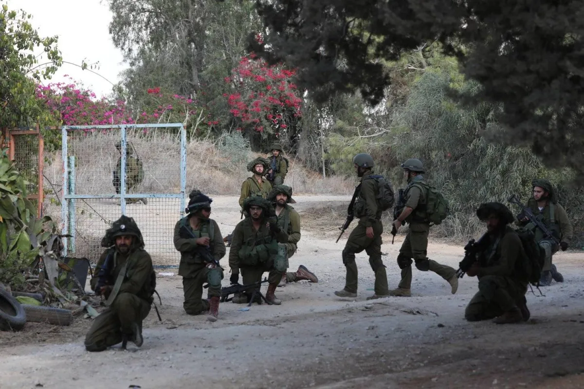 جنود إسرائيليون أمام مستوطنة كفار عزة في غلاف غزة (إ.ب.أ)