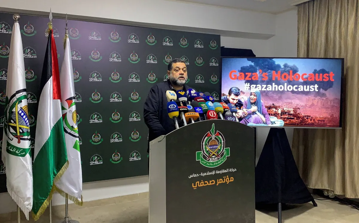 القيادي في حركة «حماس» أسامة حمدان خلال مؤتمر صحافي في بيروت (رويترز)