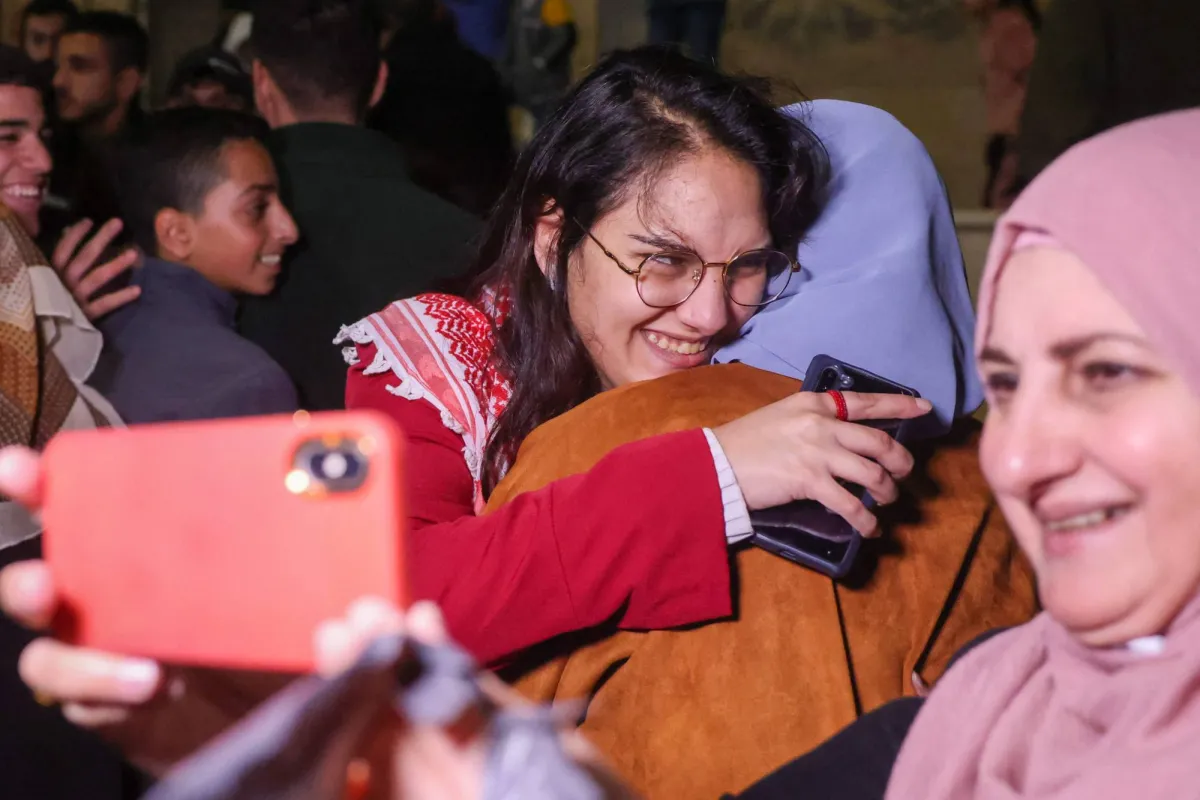 رغد نشأت صلاح الفني (وسط) والتي أفرج عنها من ضمن الأسرى في السجون الإسرائيلية خلال صفقة تبادل مع حركة (حماس) أمس في بيتونيا في الضفة الغربية (أ.ف.ب)