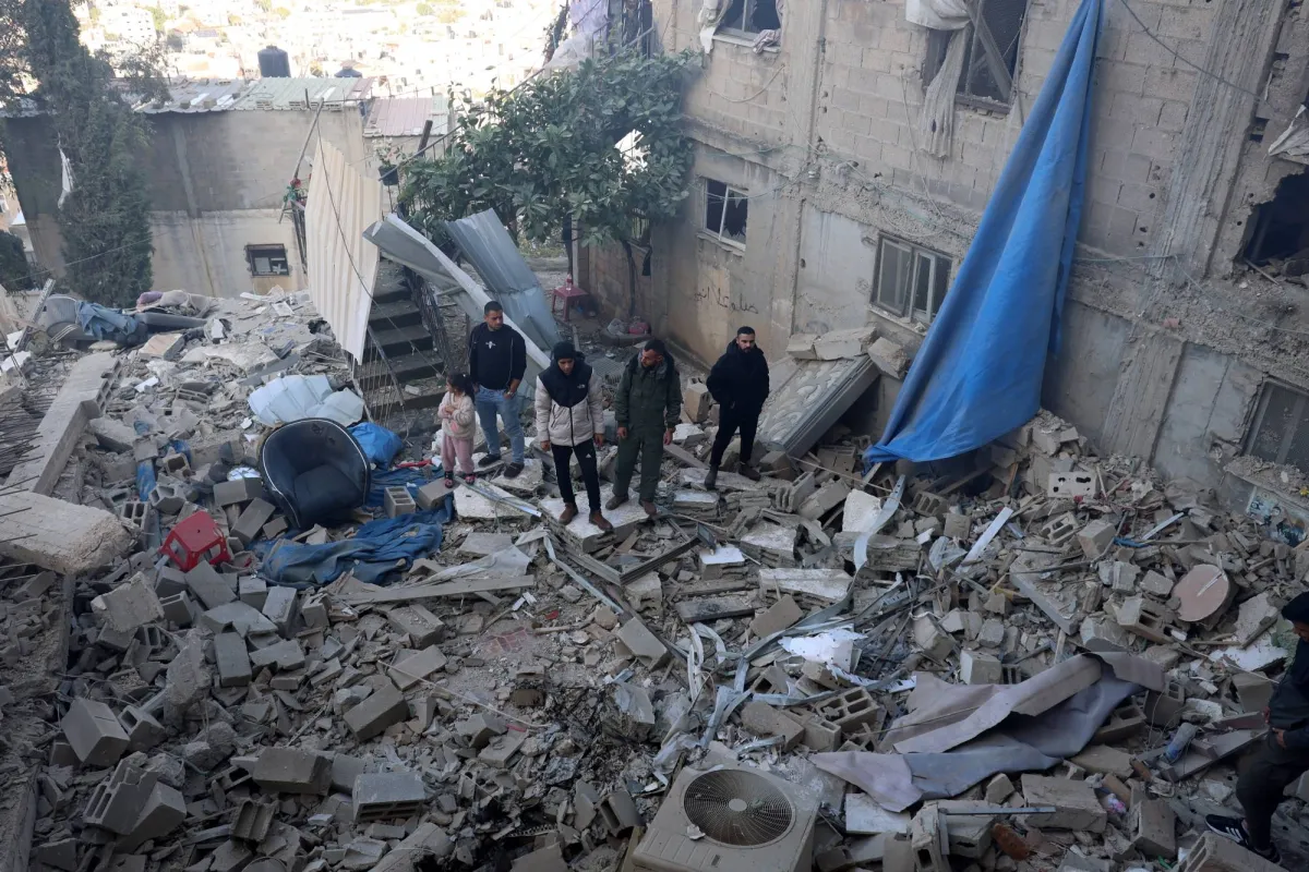 أشخاص يقفون في محيط منزلهم المدمر إثر العدوان على مخيم جنين (إ.ب.أ)