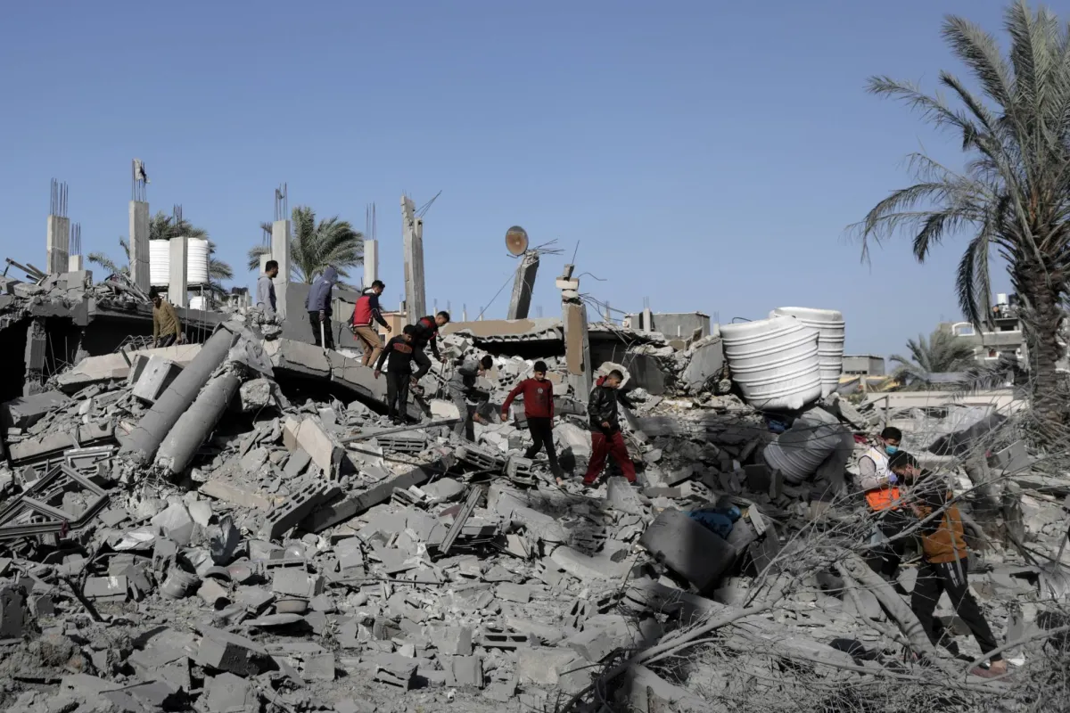 فلسطينيون يسيرون بين أنقاض المباني المدمرة في مخيم النصيرات للاجئين على طول طريق صلاح الدين وسط قطاع غزة (إ.ب.أ)
