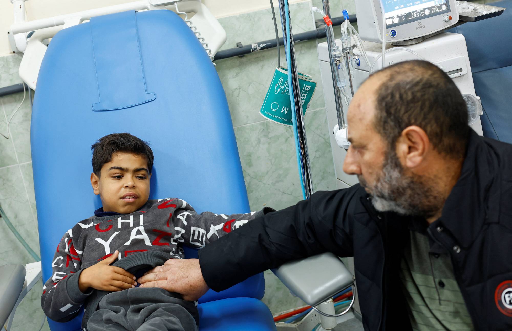 الطفل نسيم مهرة خلال إحدى جلسات الغسيل الكلوي في رفح (رويترز)
