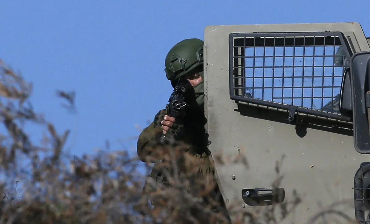 جندي إسرائيلي مشهراً سلاحه خلال اقتحام القوات الإسرائيلية لمخيم الفارعة في الضفة الغربية (إ.ب.أ)