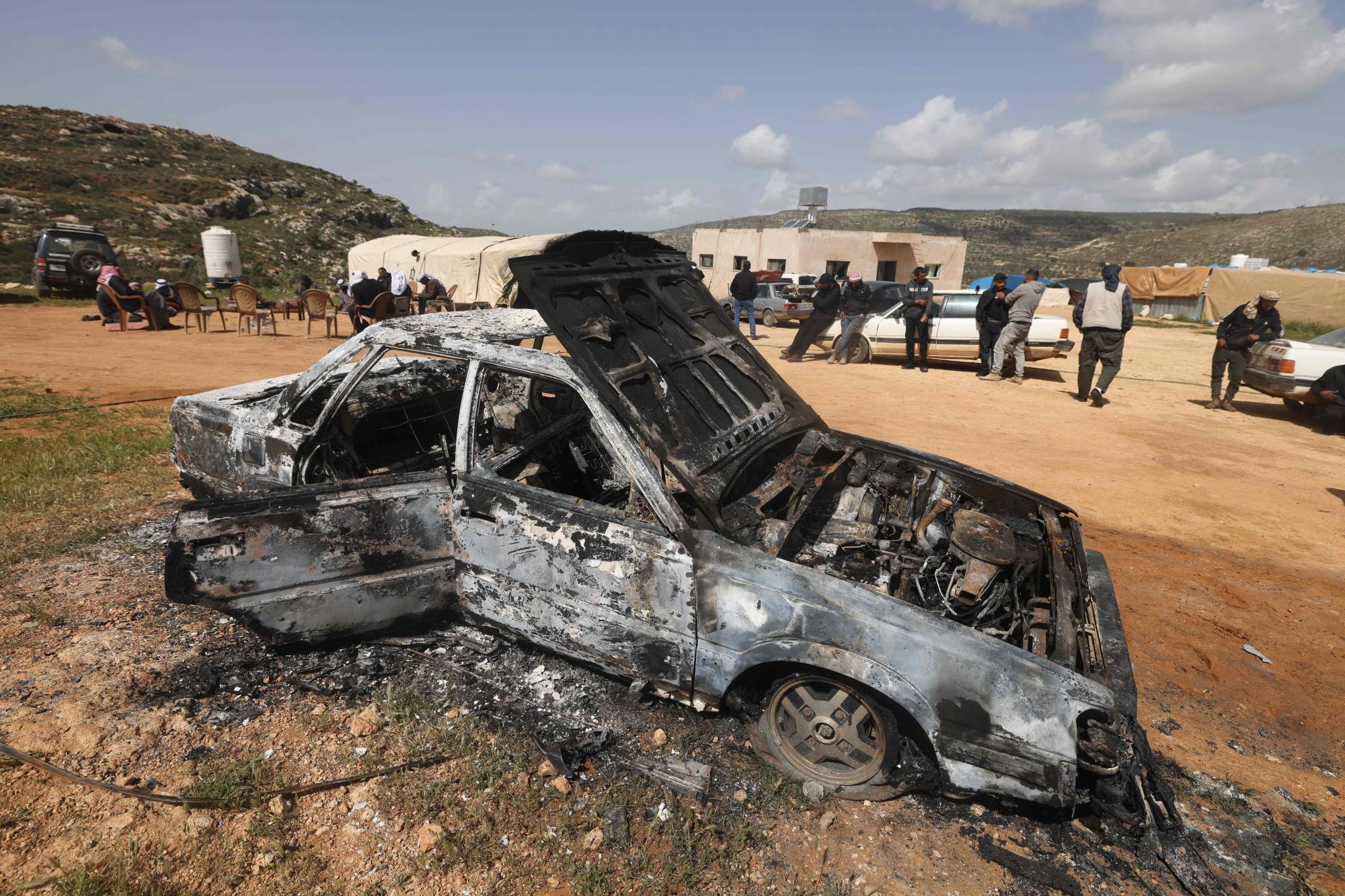 فلسطينيون قرب مركبة أحرقها مستوطنون إسرائيليون على مشارف قرية اللبان الشرقية جنوب نابلس بالضفة الغربية (أ.ف.ب)