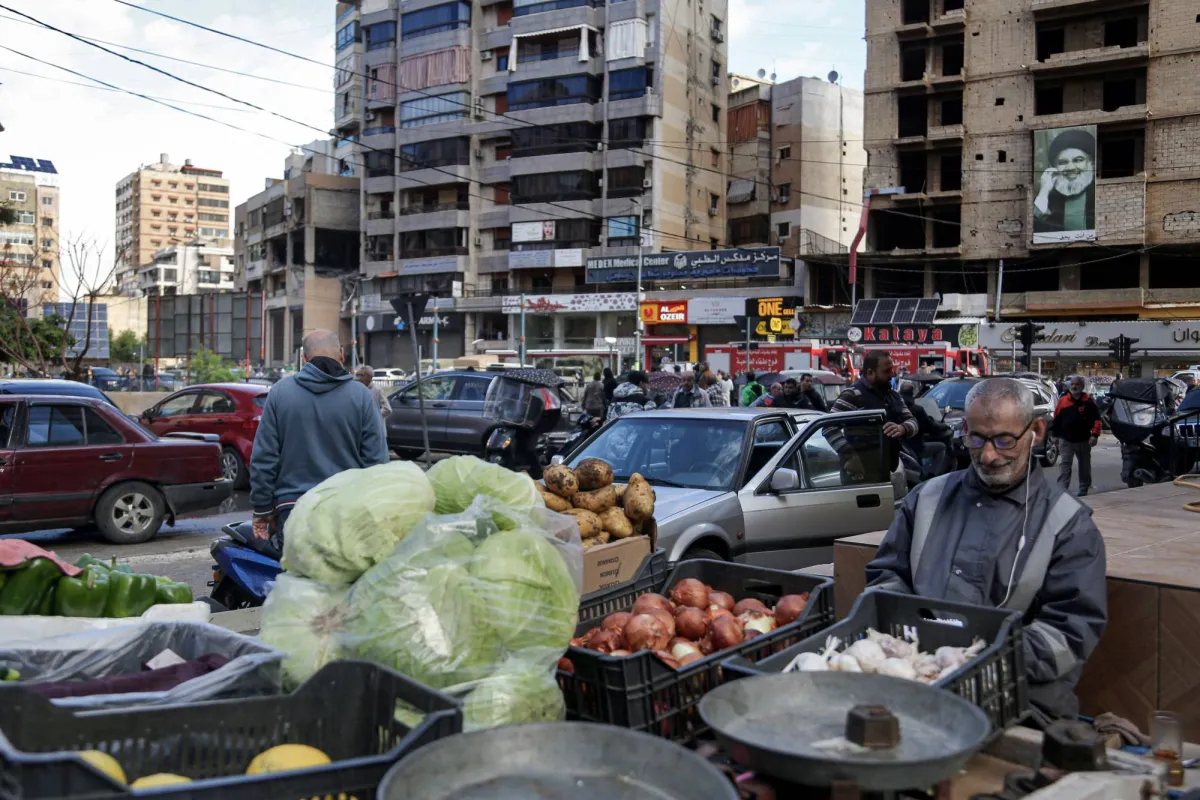 بائع خضراوات ينتظر العملاء خارج المنطقة التي تعرض فيها مكتب «حماس» (أقصى اليسار) لهجوم إسرائيلي أدى إلى مقتل صالح العاروري (د.ب.أ)