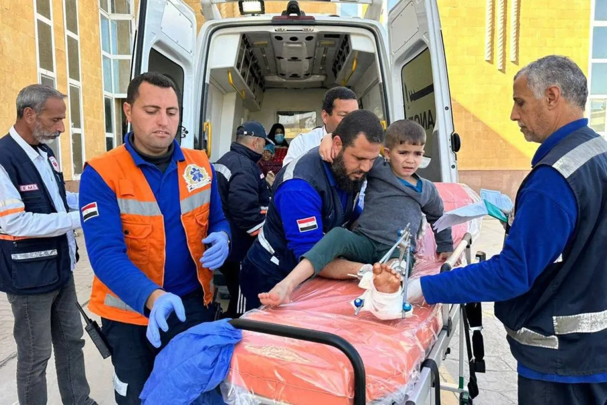 مسعفون مصريون يستقبلون طفلاً فلسطينياً مصاباً عبر معبر رفح الحدودي مع غزة (أ.ف.ب)