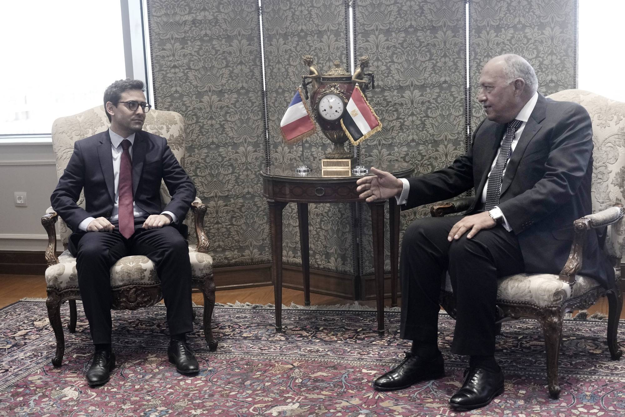 .ومن جانبه، قال وزير الخارجية المصري سامح شكري خلال لقاء سيجورنيه : «أكدنا أهمية وقف إطلاق النار في غزة، ودخول المساعدات للقطاع»، مضيفا أنه «يجب التعامل مع القضية الفلسطينية عبر إطار سياسي شامل»، مطالباً بـ«تحديد إطار زمني لإقامة دولة فلسطينية مستقلة».وأكد الوزير شكري العمل على تعزيز العلاقات الاستراتيجية بين مصر وفرنسا.