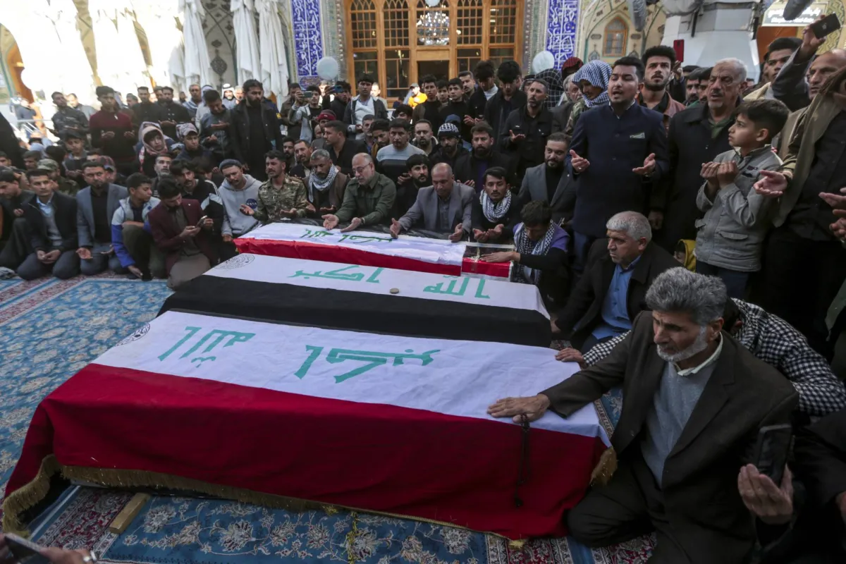 مراسيم نشييع عناصر الحشد الشعبي الذين قضوا في الضربات الأميركية بالنجف أمس (أ.ب)