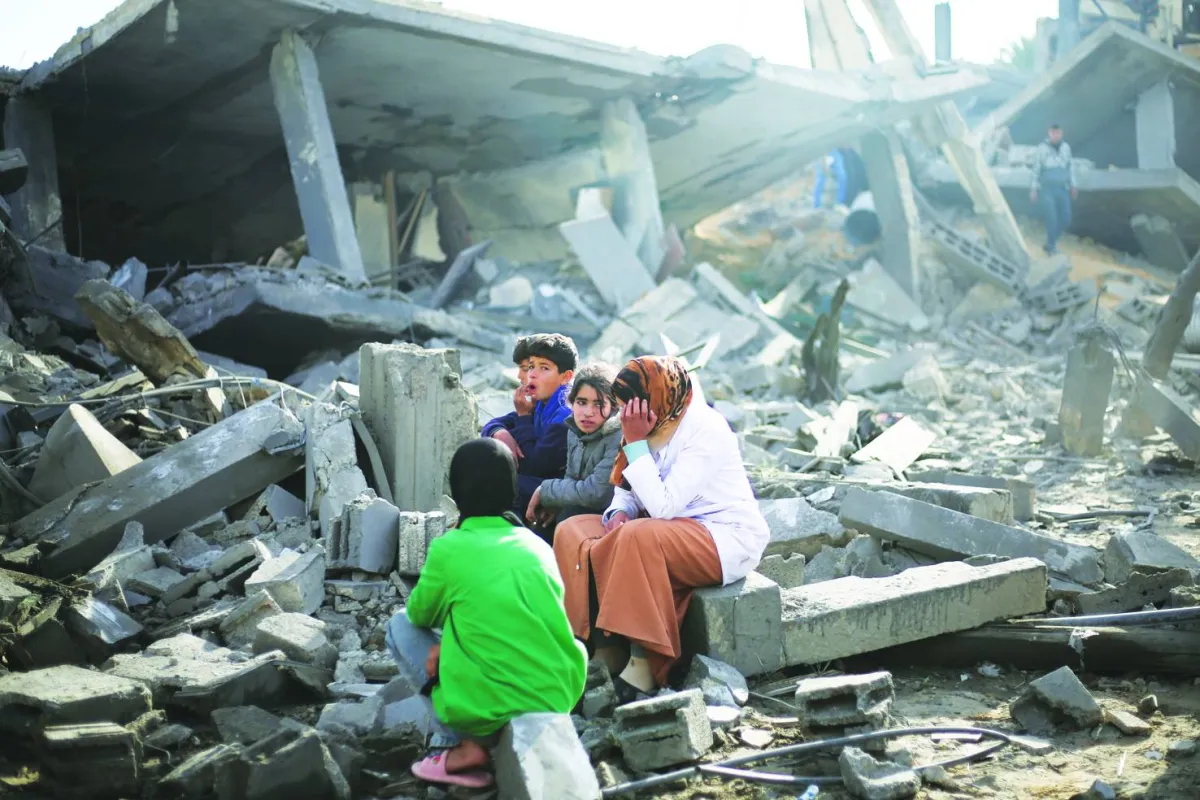 فلسطينيون يجلسون وسط الدمار الذي خلّفه قصف إسرائيلي في رفح أمس (أ.ب)