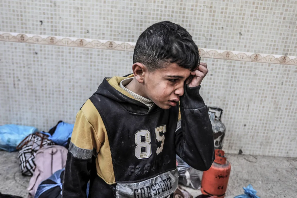 طفل فلسطيني يبكي بعد غارة إسرائيلية في رفح جنوب غزة (د.ب.أ)