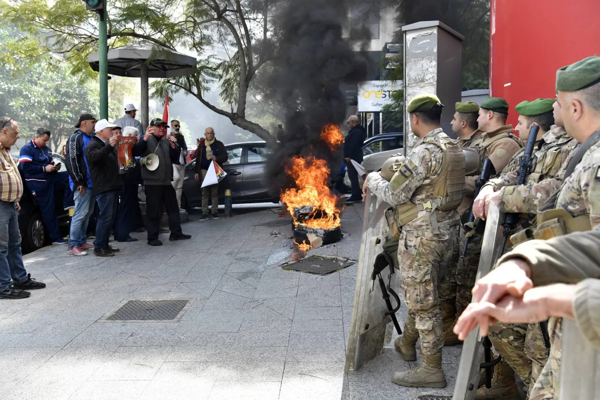 عسكريون يقومون بحماية أحد المصارف خلال قيام عدد من المودعين بإحراق الإطارات المشتعلة (إ.ب.أ)