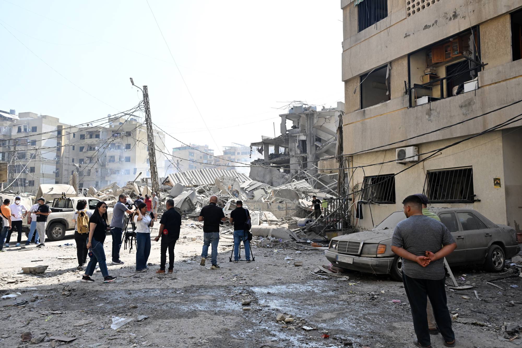 مواطنون يتجمعون أمام مبنى مدمّر بالضاحية الجنوبية لبيروت إثر غارات إسرائيلية استهدفته قبل أشهر (أرشيفية - إ.ب.أ)
