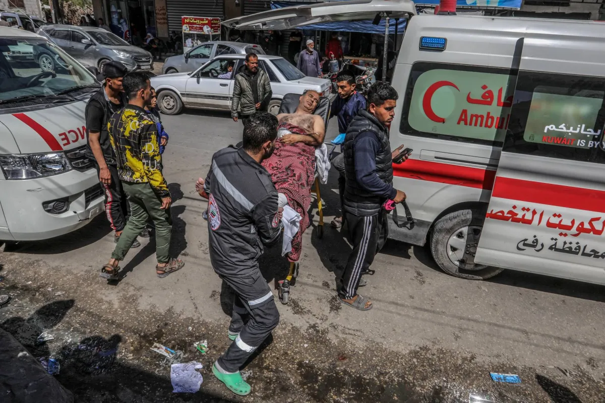 وصول الجرحى الفلسطينيين الذين أصيبوا في غارة جوية إسرائيلية بالقرب من أحد مستودعات «الأونروا» إلى مستشفى النجار في رفح (د.ب.أ)