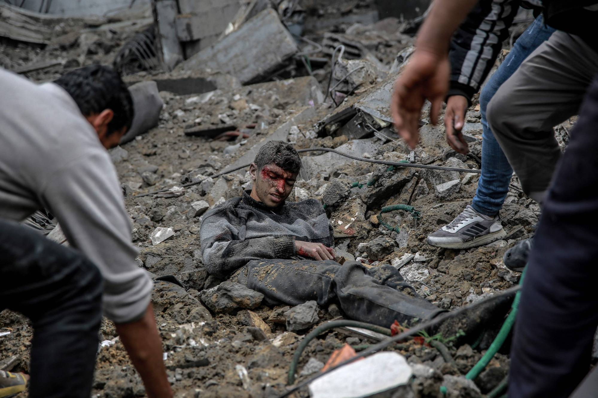 فلسطينيون يسارعون لمساعدة شاب جريح بعد القصف الإسرائيلي على وسط مدينة غزة (أ.ف.ب)