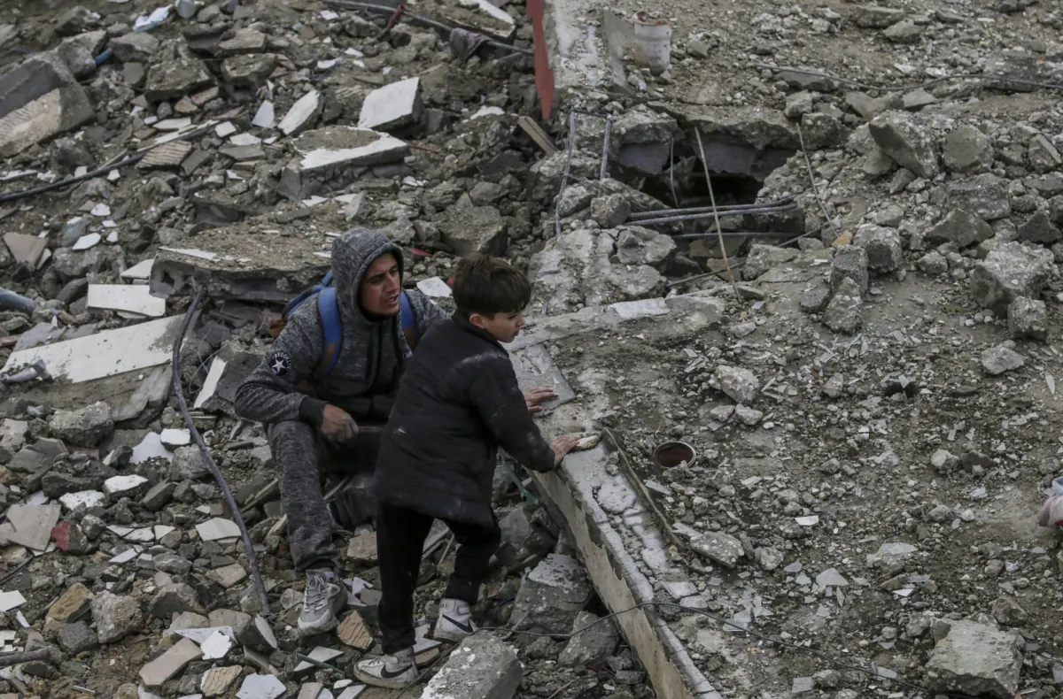 فلسطينيون يبحثون عن أحياء وسط الأنقاض المدمرة بفعل القصف الإسرائيلي في منزل عائلة الحاج بمخيم النصيرات جنوب قطاع غزة (إ.ب.أ)