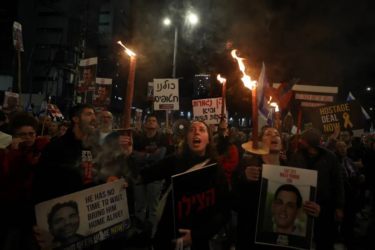 عائلات الرهائن الإسرائيليين الذين تحتجزهم «حماس» يتظاهرون ضد حكومة بنيامين نتنياهو في تل أبيب (إ.ب.أ)