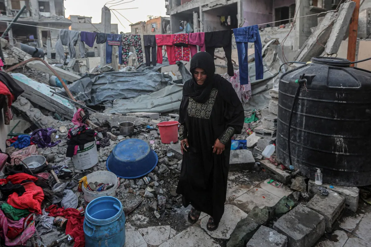 سيدة فلسطينية تعلق ملابسها وسط حطام منزل دمره القصف الإسرائيلي (أ.ف.ب)