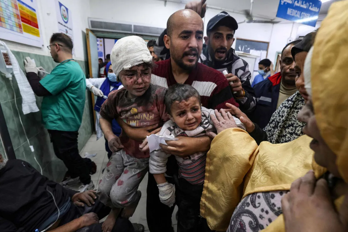 رجل يحمل أطفالاً أصيبوا في غارات إسرائيلية بمستشفى النجار في رفح (أ.ف.ب)