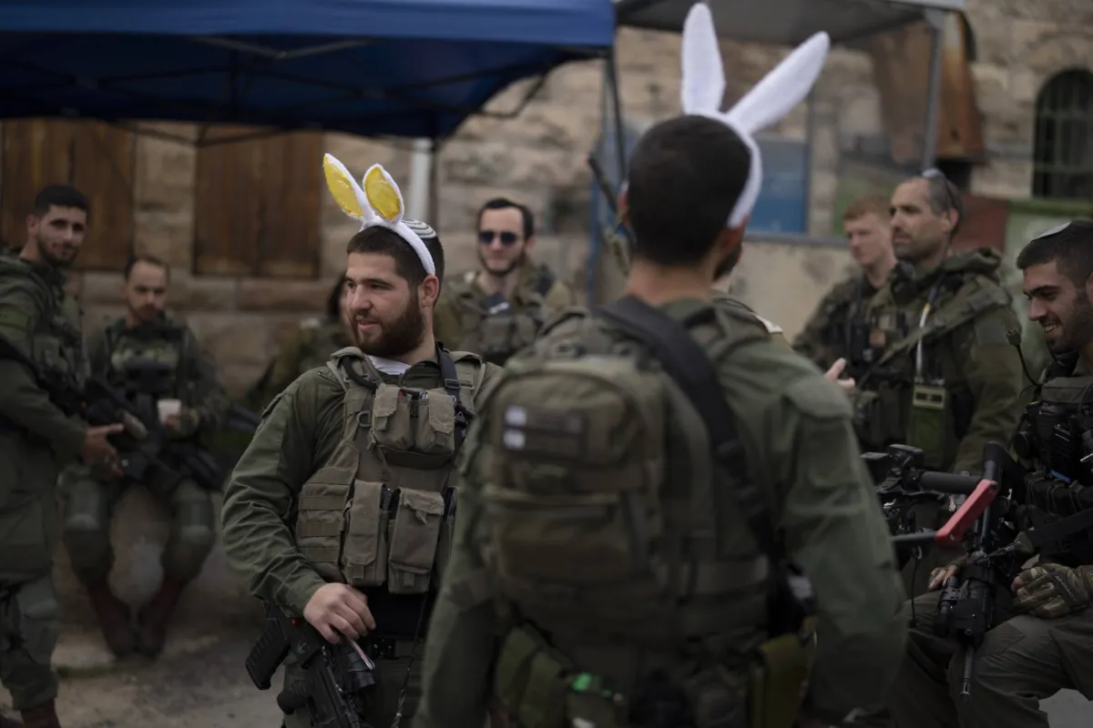 جنود إسرائيليون خلال مسيرة في الخليل بالضفة الغربية احتفالاً بعيد البوريم (أ.ب)