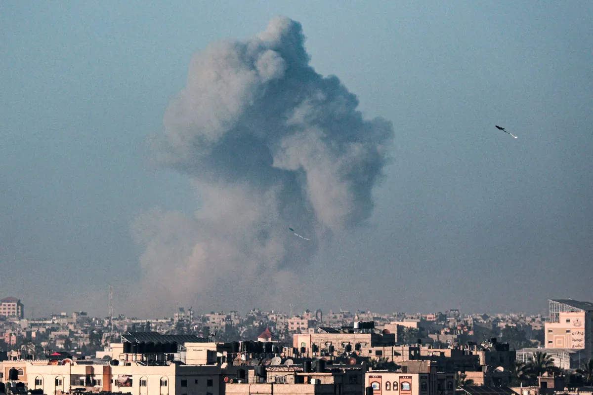 صورة مأخوذة من رفح تظهر تصاعد الدخان أثناء القصف الإسرائيلي على خان يونس في جنوب قطاع غزة (أ.ف.ب)
