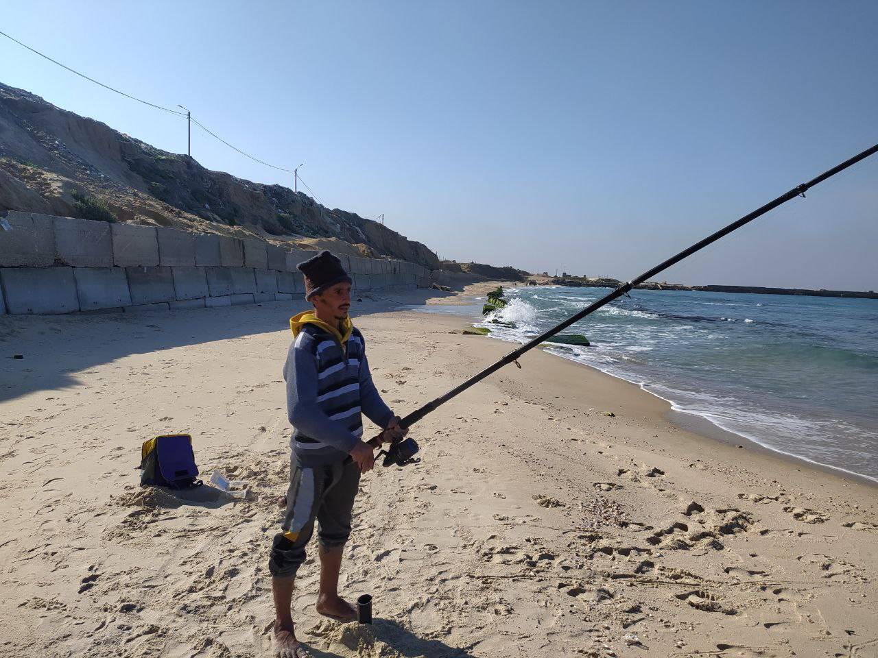 وعلى مسافة نحو 500 متر، يمضي الصياد إياد الأقرع (32 عاماً) كامل يومه وهو يمد سنارته داخل البحر، لعله يظفر بقليل من الأسماك يعود به لعائلته أو يبيع هذه الأسماك إن كانت كميتها تتجاوز 3 كيلوغرامات.