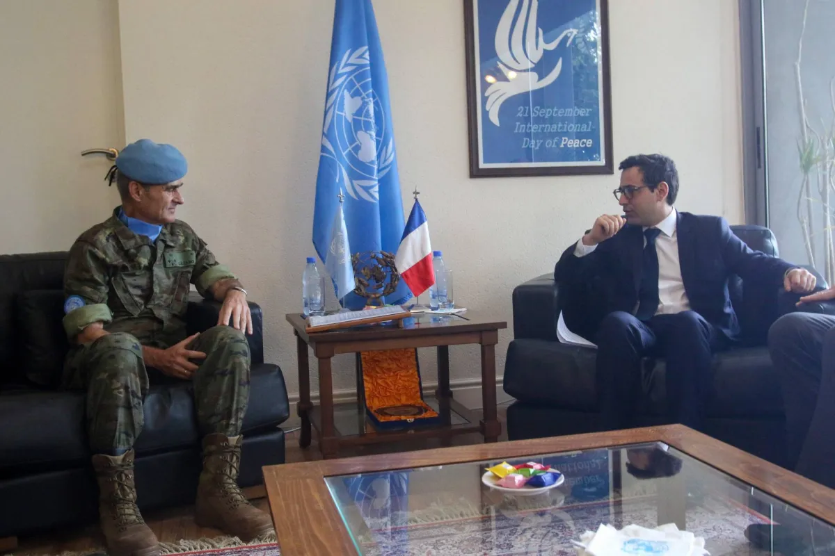 وزير الخارجية الفرنسي خلال لقائه اللواء أرولدو لازارو ساينز رئيس بعثة «اليونيفيل√ في بلدة الناقورة بجنوب لبنان (أ.ف.ب)