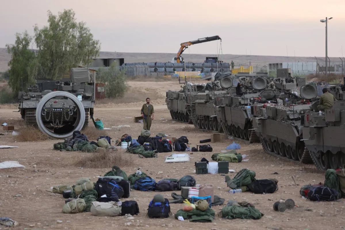 جنود احتياط إسرائيليون يستعدون بجوار ناقلات جنود مدرعة في معسكر للجيش بالقرب من بئر السبع (أرشيفية - إ.ب.أ)