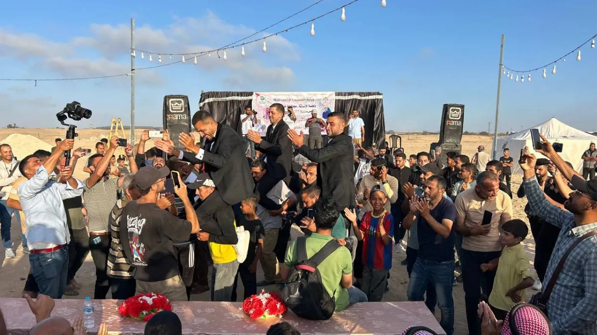 يصعد العرسان منصة الحفل ويتزايد التصفيق وصفارات الشباب مع انطلاق أولى الأغاني لفرقة النشيد المكونة من ثلاثة أفراد ألهبوا المكان بالمزاوجة بين أغاني الأعراس الفلسطينية التقليدية المتناغمة مع أوضاع الحرب الراهنة، وأناشيد الحماسة الوطنية التي تفيض بكلمات تحدي إسرائيل وإصرار الفلسطينيين على تحرير وطنهم مهما كانت التحديات.