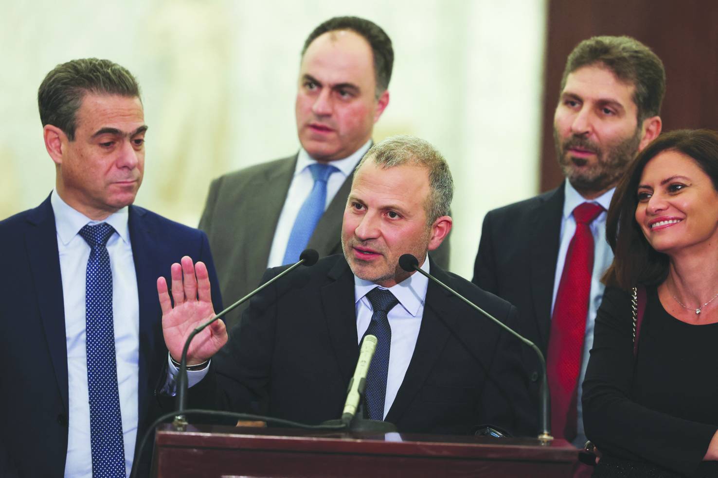 رئيس «التيار الوطني الحر» النائب جبران باسيل ونواب في كتلته بعد تسمية نواف سلام لرئاسة الحكومة (أرشيفية - رويترز)