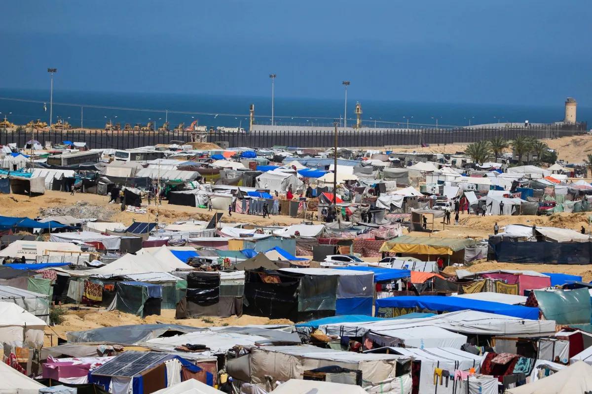 نصب النازحون الفلسطينيون الخيام في المواصي بالقرب من الحدود مع مصر برفح بجنوب قطاع غزة (أ.ف.ب)