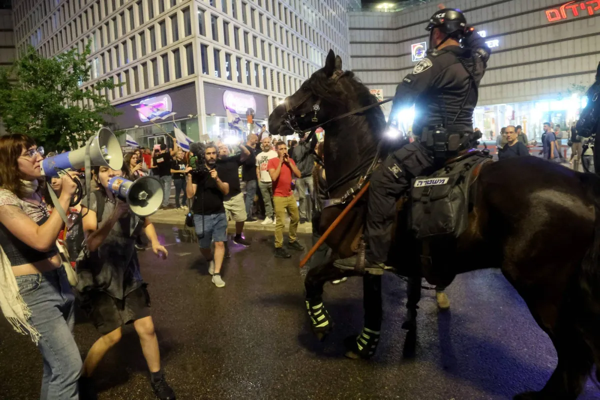 شرطي إسرائيلي على صهوة جواد خلال مظاهرة في تل أبيب تطالب نتنياهو بإعادة المحتجزين في غزة (أ.ف.ب)